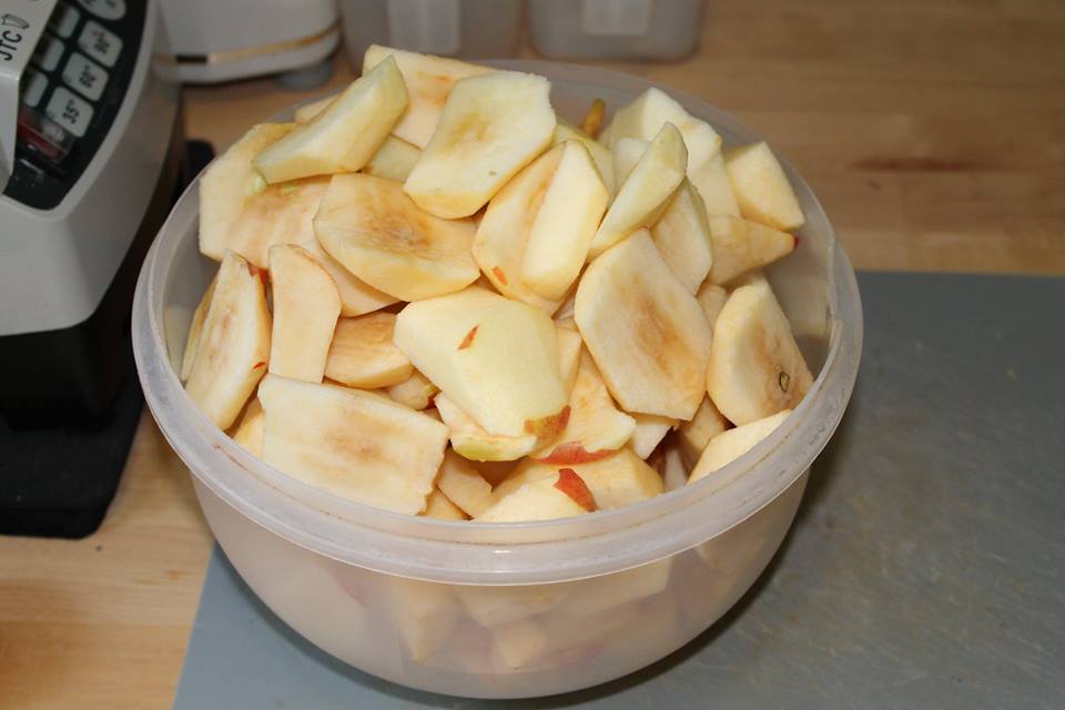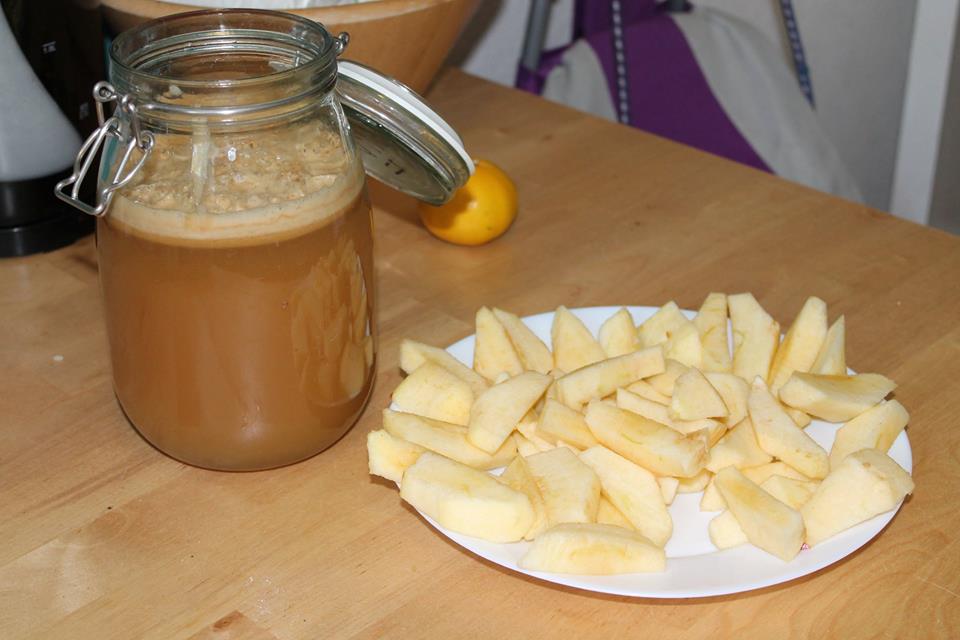 Es werden 30 Pinklady Äpfel entsaftet und 5 Breaburn Äpfel geschällt und zum Naschen geschnitten. Der entsaftete Apfelsaft wird mit etwas Zimt verfeinert. Aus dem Apfeltrester kann man Kekse im Ofen machen oder für rohen Kuchen verwenden oder für viele andere Ideen.