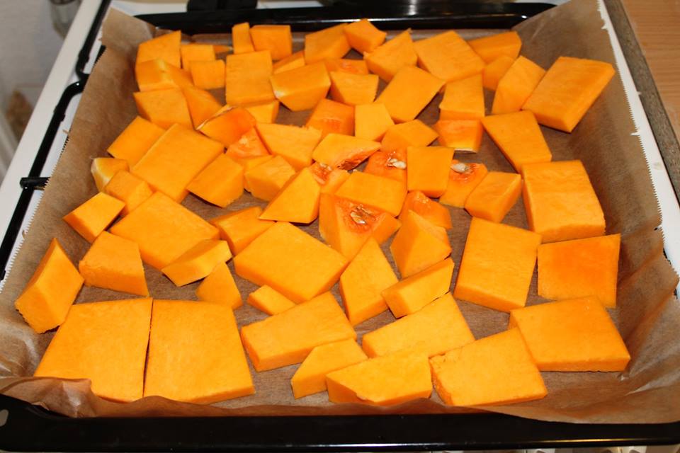 Ein ganzer Butternutkürbis wird in mundgerechte Stücke geschnitten und im Ofen bei 200 Grad gebacken. Die Kartoffeln werden zusammen mit 2 Lorbeerblättern gedünstet.  Am Ende wird der Butternut mit Brennesellsamen bestreut. Sehr LEKKA
