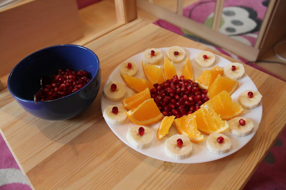 Das sind geschnittene Orangen in Form einer Sonne und Granaräpfel als Kern der Blume mit Bananendeko