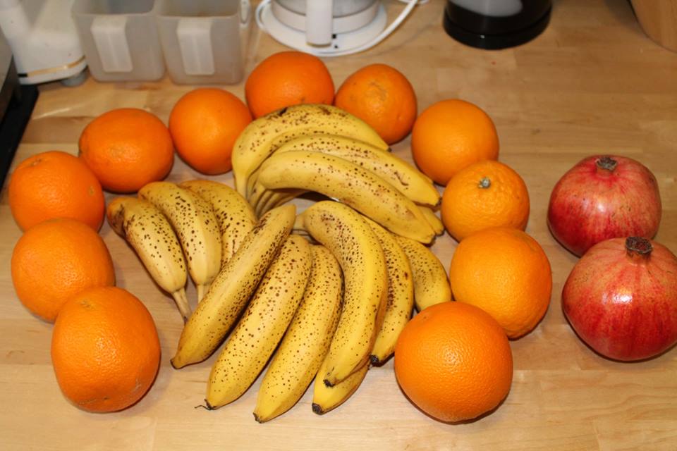 Den Mixer voll machen mit reifen Bananen und ausgepressten Orangensaft einfüllen. Etwas Smoothie auf einen Teller als Pudding abgessiesen. Granatapfelkerne als Müsli verwenden und fertig ist das Powerfrühstück