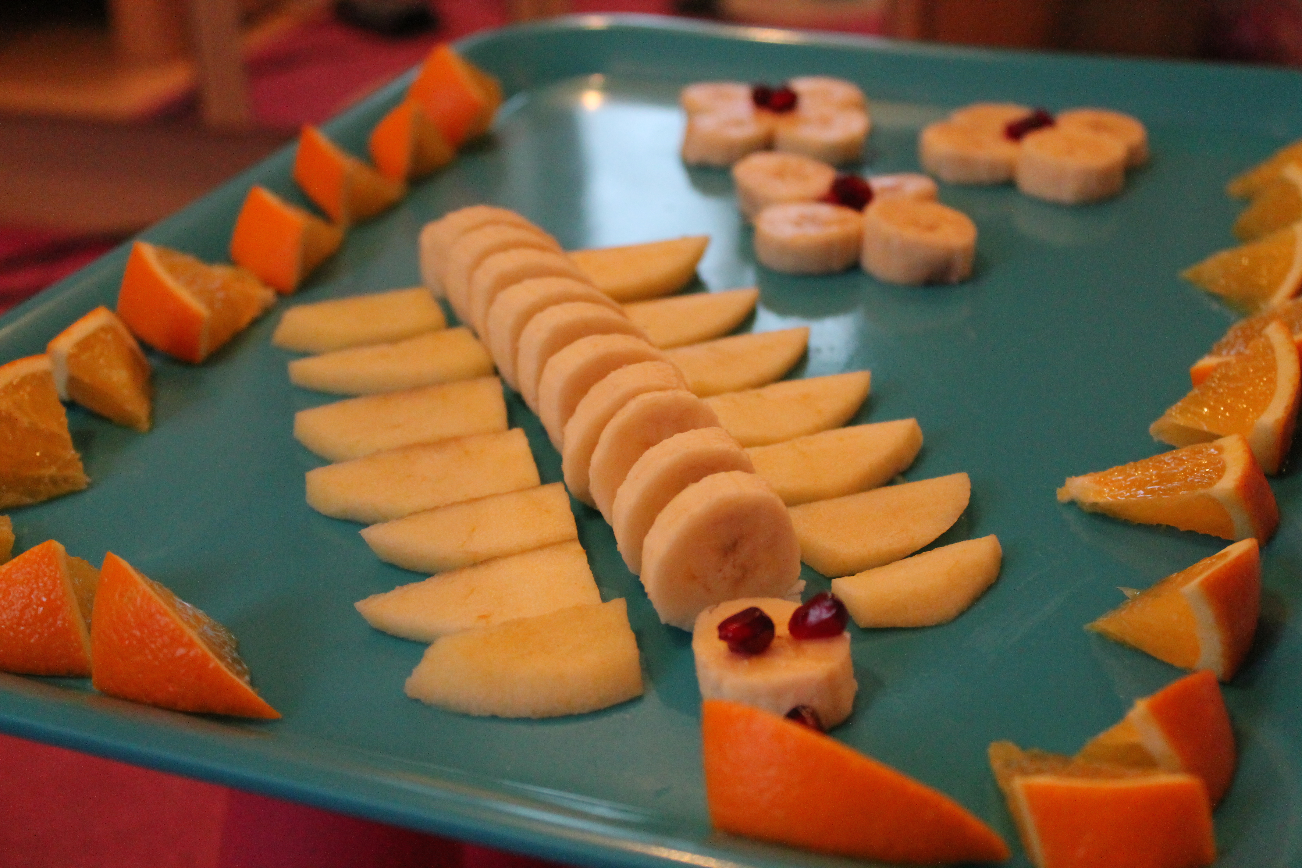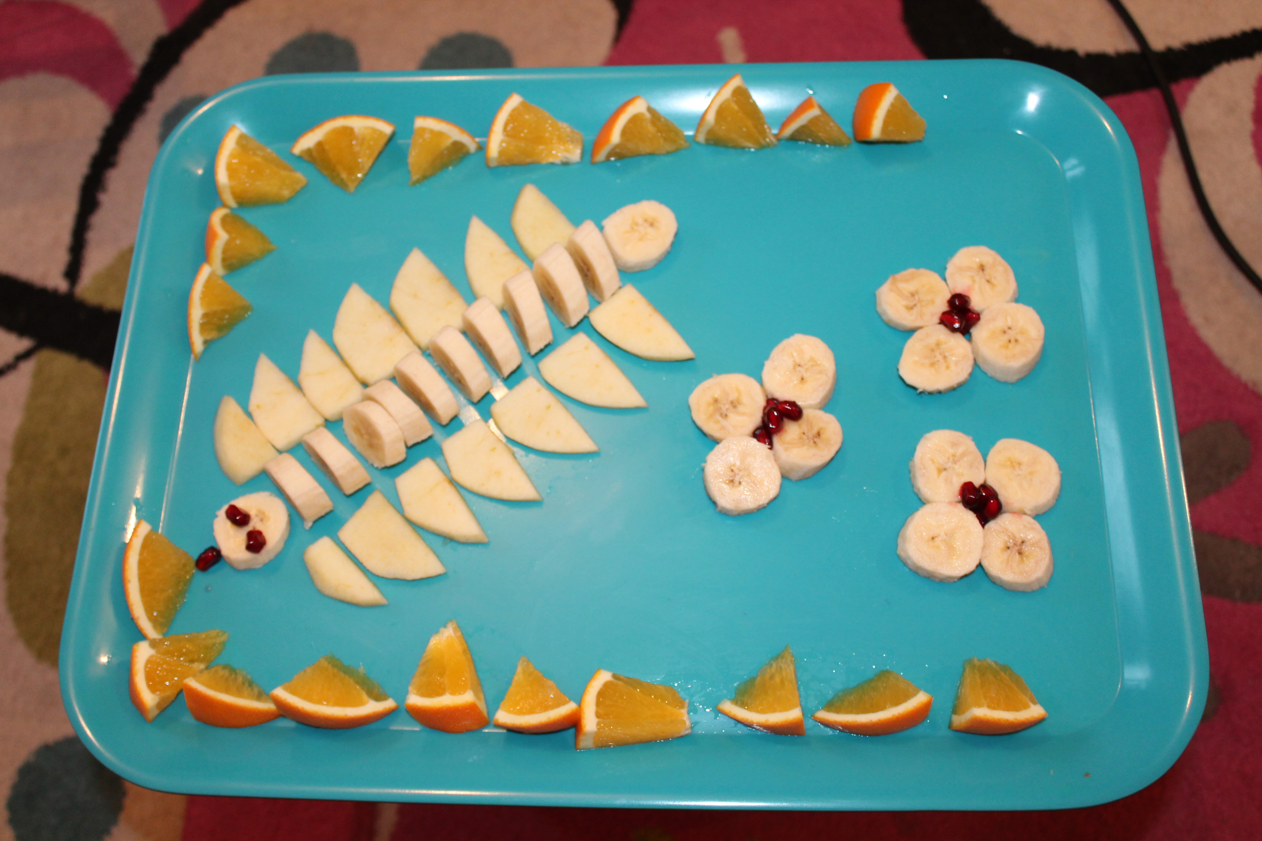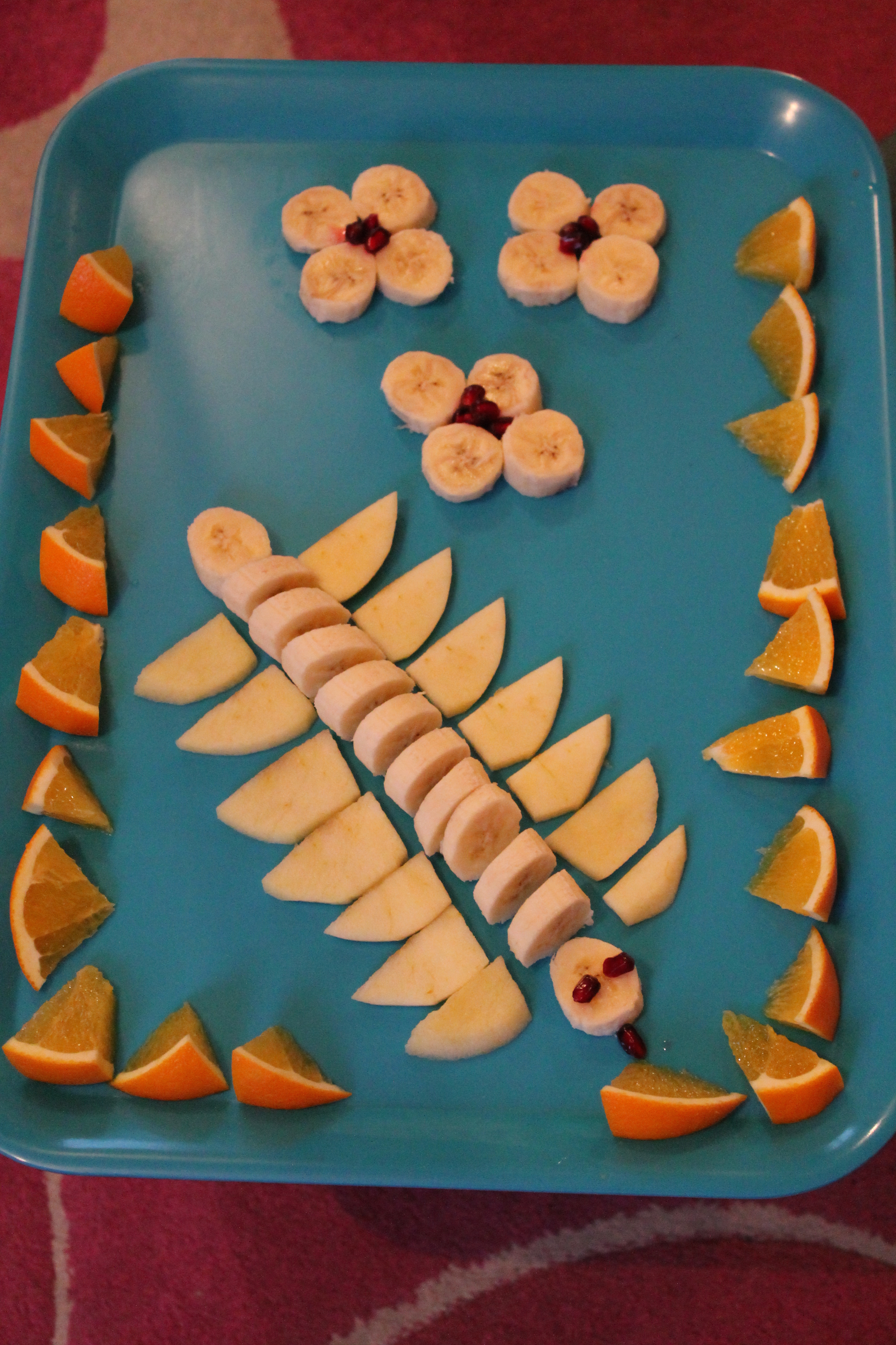 Aus einer Banane habe ich den Körper des Bananenfüsslers geformt. Vorne den Kopf mit Augen und Zunge aus Granatäpfeln bestückt und hinten ein flaches Bananenstück als Schwänzle. Die Füsslis sind aus Apfelscheiben geformt und aus den restlichen Bananen habe ich einige Blumen gemalt mit Granatapfelkernen als Blütenektar. Elena mag immer gern Orangenstücken auf ihren Obstbild 😉 also mussten Orangen noch irgendwie integriert werden 😉