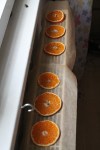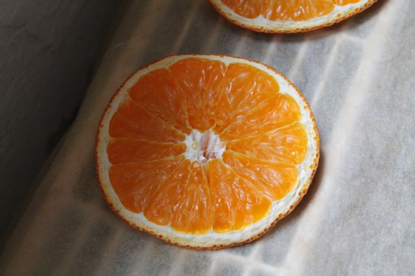 Ich schneide gleichmässige Orangenscheiben ab und trockne sie schon vorab mit einem Küchentuch, so gut wie geht. Wir trocknen gern die Orangen im Schlafzimmer, da sie einen sehr angenehmen natürlichen Raumduft versprühen und es sich einfach wunderbar schlafen lässt. Ich lege passend abgeschnittenes Backpapier auf die Heizung, und dann die abgetrocknetene Orangenscheiben drauf. Dann muss man nur nocht warten! Jeden Tag sollte man die Orangenscheiben wenden! Bitte nicht über 20-22 Grad heizen! Sie werden sonst braun und werden hässlich. Den genauen Zeitraum, wann sie fertig trocken sind kann ich leider nicht pauschal bestimmen. Wir heizen am Tage nicht, erst bei Sonnenuntergang geht die Heizung an. Wir haben bei uns nie mehr als 20 Grad eingestellt und wir haben Gasheizung. Bei uns sind die Orangenscheiben nach 1,5 bis 2 Wochen fertig 😉
