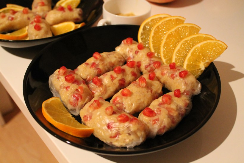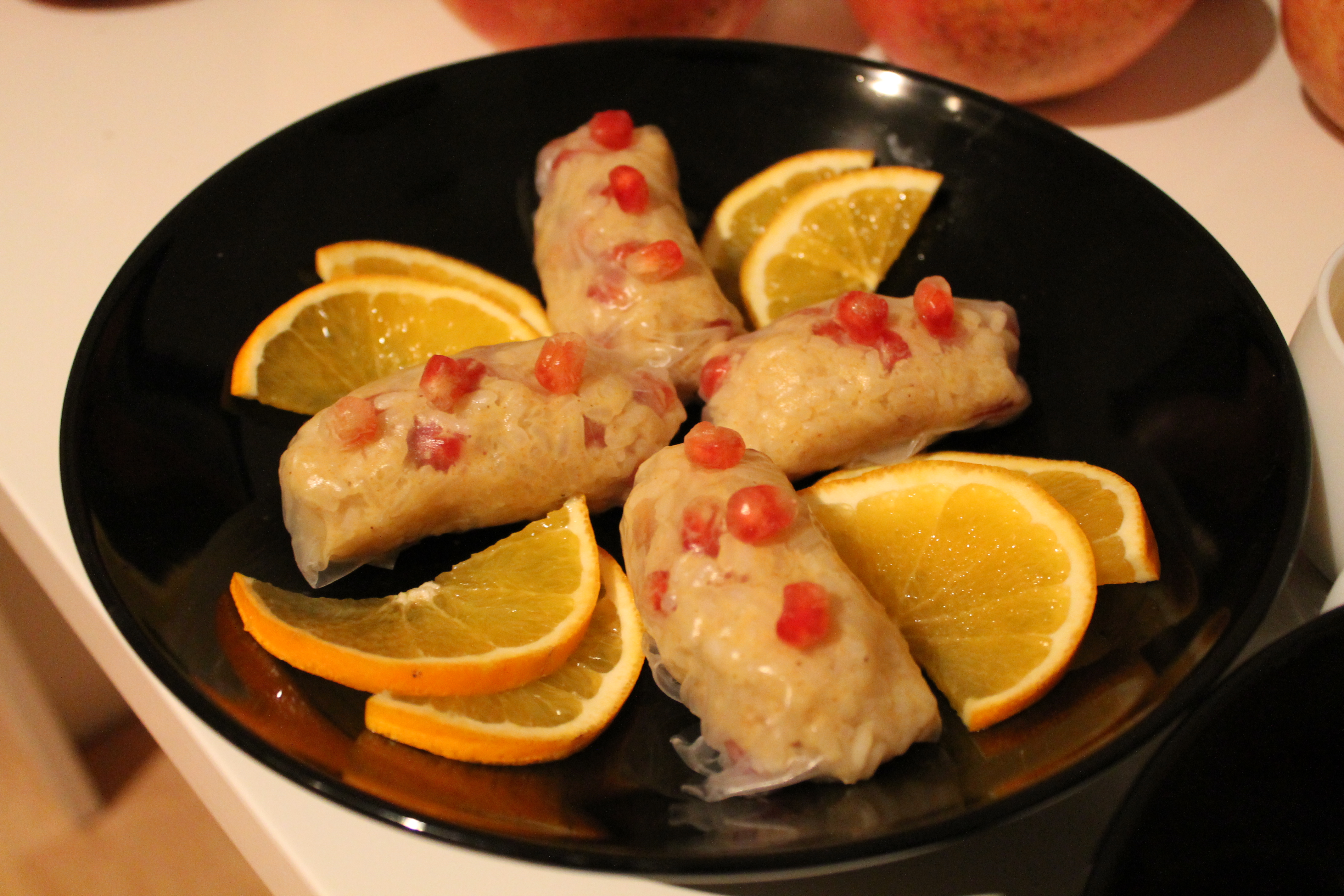 Das Reispapier kann man mittlerweile überall auch im normalen Lebensmittelhandel kaufen und nicht nur bei den Asiaten. Ich habe die kleine Variante genommen, da mir die Grossen zu viel Arbeit machen, die Rollen zu hart werden und Elena sie nicht durchbeissen kann. Zuerst habe ich einen grossen süssen Granatapfel entkernt und eine Tasse Reis gekocht. Der Reis sollte abgekühlt sein bevor ihr den weiterverarbeitet. Das wichtigste bei diesem Gericht ist die Sosse, die alles zusammenhält. 3 süsse Orangen werden gemixt zu einer Sosse und ein bis zwei EL Mohnmus oder Mohbrei wird hinzugefügt. Diese Sosse wird mit dem Reis und den Granatapfelkernen vermischt. Etwas Sosse wird als Dip übrig gelassen. Für das Reispapier wird in einer grossen Schale oder einem grossen Topf warmes oder heisses Wasser eingegossen ( es soll wohl auch mit kalten gehen, hat bei mir aber nicht so gut geklappt ). Dann nehmt ihr ein Reispapier und badet es vorsichtig in dem Wasser. Es bedarf etwas Übung, da es wirklich nicht so einfach ist und schnell verklebt. Sie werden so lange eingeweicht bis sie nicht mehr hart sind, dann legt ihr sie euch auf ein Unterlage. Wie Sushi wird dann etwas Füllung am untersten Rand aufgetan und zu einer Rolle gedreht. Ich habe oben als Dekoration noch einige Granatäpfel genommen und mit Orangenscheiben auf einem Teller angerichtet. Ich war sehr begeistert von der Mahlzeit und kann sie euch sehr empfehlen. Die Kombination Fruits & Rice mit Dip ist super LEKKA !!!
