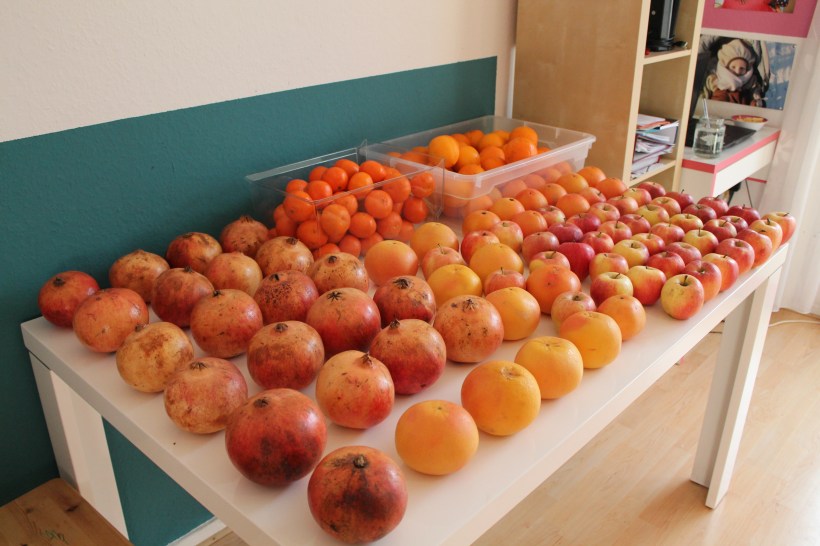 Trotzdem sind 50 Euro ausgegeben worden, man glaubt es kaum. 25 Granatäpfel hatten auch einen stolzen Preis, bissle Äpfel, grosse und kleine Grapefruits, süsse Orangen und süsse Clementinen. Das war alles, aber das haben wir jedes Jahr. Zwischen Weihnachten und Neujahr ist die Ware auf dem Markt immer ziemlich schrottich, und das waren echt die einzigen Früchte, die gut aussahen. Die Granatäpfel sind sehr süss und kernlos, was meine Tochter natürlich sehr begeistert und mich auch, da ich sie jetzt durch den Entsafter jagen kann ohne das meine Maschiene kaputt geht 😉