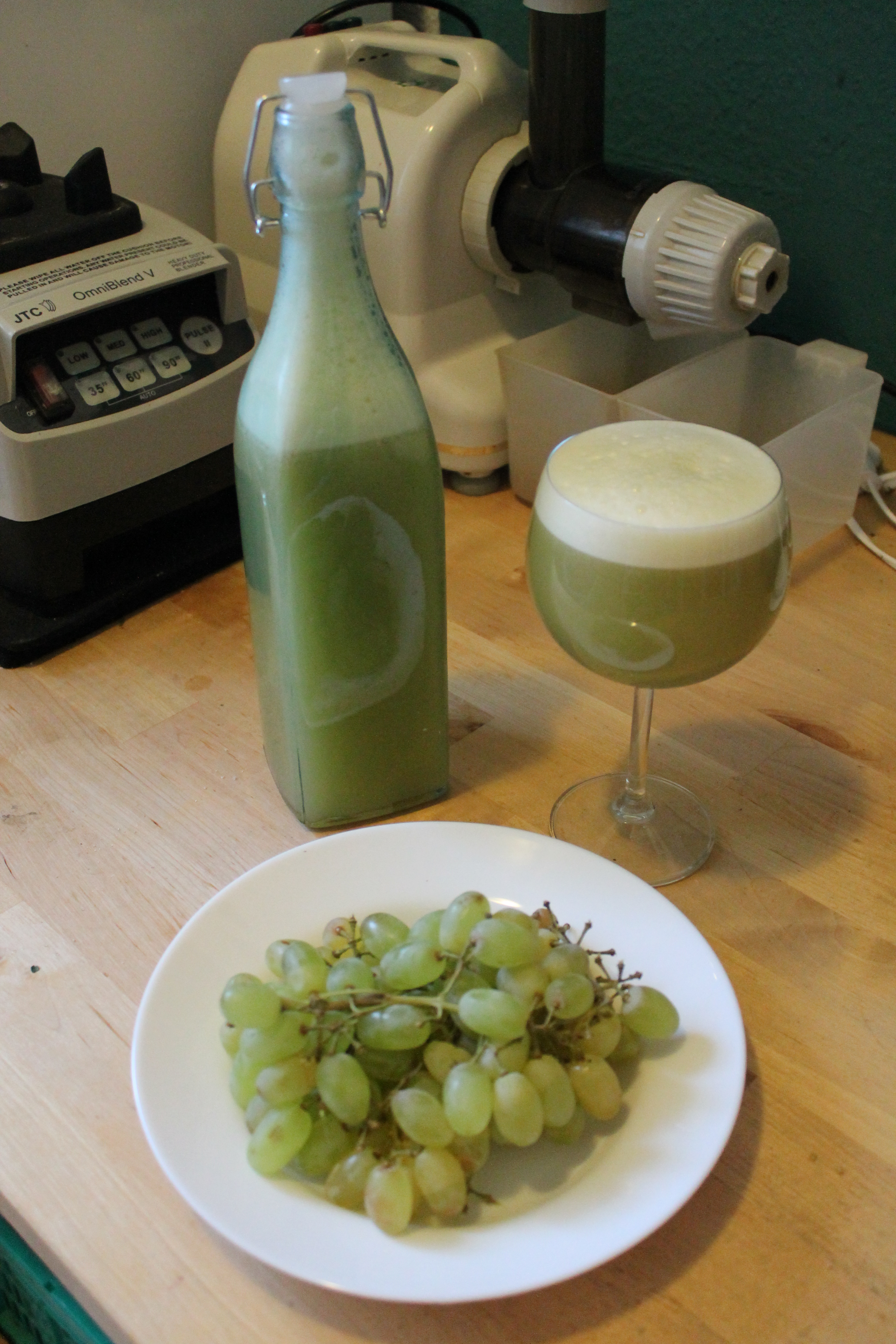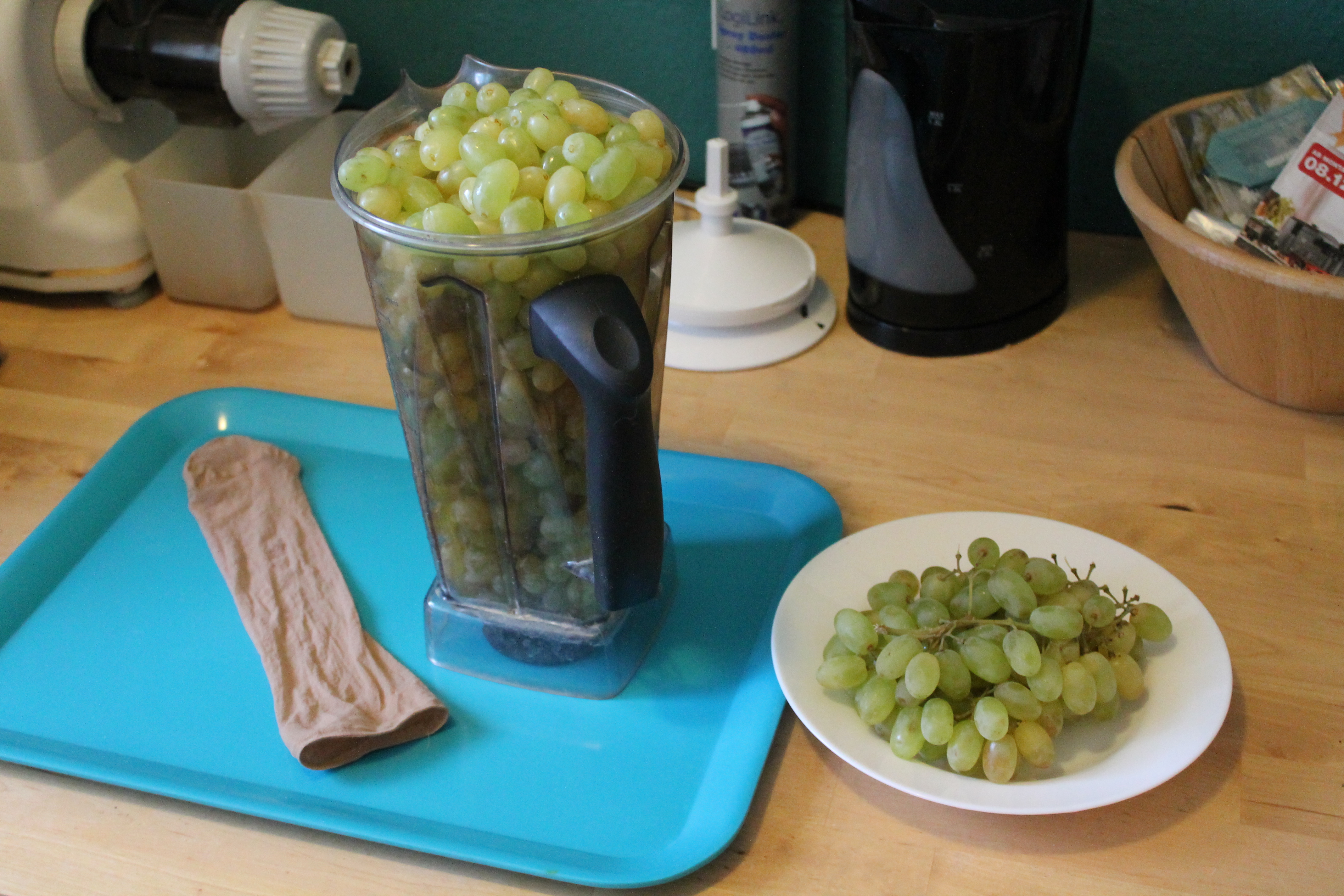 Diesmal haben wir 15 Kilo sehr süsse Sultaninen und entsaften uns jeden Tag für eine ode zwei Mahlzeiten am Tag frischen Sultaninensaft. Dafür wird der Mixer bis Oberkante voll mit Sultaninen gefüllt, etwas dest. Wasser dazu und einmal gut durchgemixt. Danach wie immer das Gemixe durch den Nylonstrumpf ziehen. FERTIG! So schnell geht das. Ein frisch gepresster Sultaninensaft in Null komma nix und eine kleine Portion Sultaninen zum knabbern noch dazu. Skoll und weg damit 😉