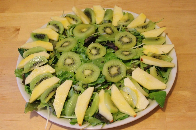 Dieser Salat ist ein gemischter Babysalat mit reifen süssen Kiwis und süssen Äpfeln. Das Dressing ist einfach nur eine frisch gepresste süsse Orange.