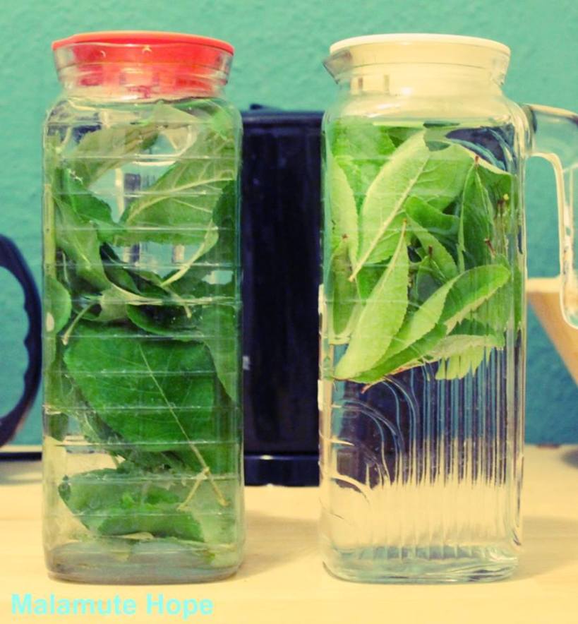 Links auf dem Bild haben wie Blätter von einem Apfelbaum mit grünen Äpfeln und rechts Blätter von einem Pflaumenbaum ziehen lassen. Das tolle ist auch, wenn die Früchte des Baumes noch nicht reif zum Essen sind, könnt ihr die selben Eigenschaften die ihr durch die Frucht bekommt viel intensiver durch das Blatt erfahren. Der Geschmack ist auch tatsächlich der Geschmack der Frucht. Wenn man das einmal probiert hat, möchte man nie mehr den Schrott aus dem Beuteln sich als Tee brühen.