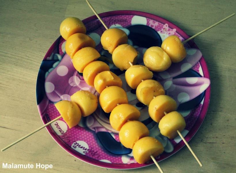 Viele Rohköstler machen Fruitpops und Fruitsticks mit Trockenfrüchten und Nüssen. Wir machen diese aus frischen Früchten, und es schmeckt toll und die Kinder freuen sich auch. Dieses mal haben wir Mangoballs verwendet.