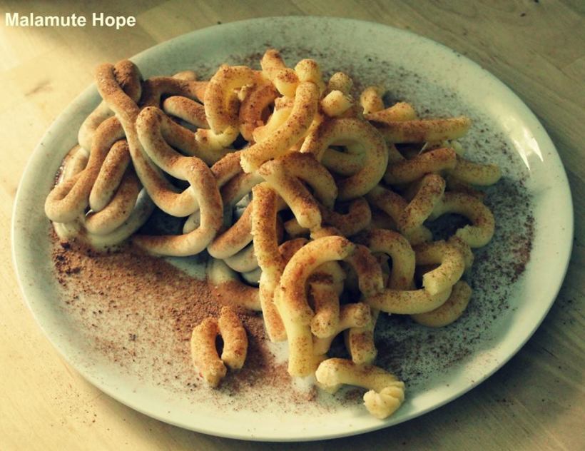 Wir machen unser Eis selber. Ich presse gefrorenes Obst durch die Saftpresse und fertig ist das lekka Eis. Diese Variante war sehr schmackhaft. Gefrorene Bananen und Äpfel bestreut mit einem Gemisch aus Zimt und Kokosnusszucker.