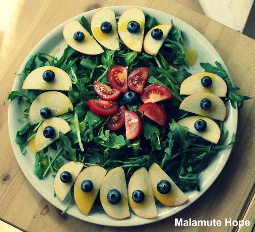 Auf einem XXL Pizzateller bildet der Hauptteil des Salates der Rucolasalat. Ich habe süsse Äpfel in Scheiben geschnitten, und sie schön auf dem Teller verteilt, das Gleiche habe ich mit Tomaten gemacht. Wir hatten noch etwas Blaubeeren im Kühlschrank und damit dekorierte ich die Fruchtscheiben.