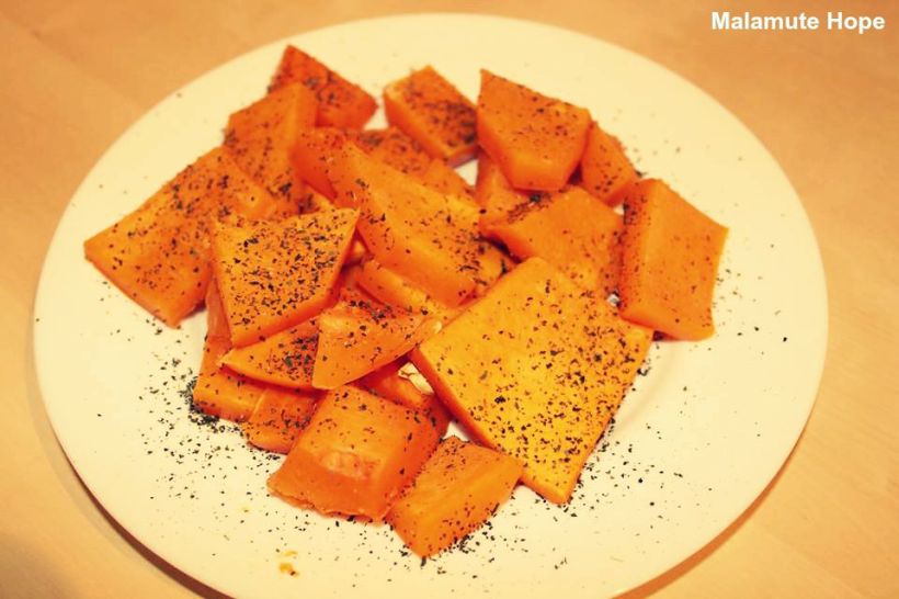 Ein ganzer Butternutkürbis wird in mundgerechte Stücke geschnitten und im Ofen bei 200 Grad gebacken. Die Kartoffeln werden zusammen mit 2 Lorbeerblättern gedünstet.  Am Ende wird der Butternut mit Brennesellsamen bestreut. Sehr LEKKA