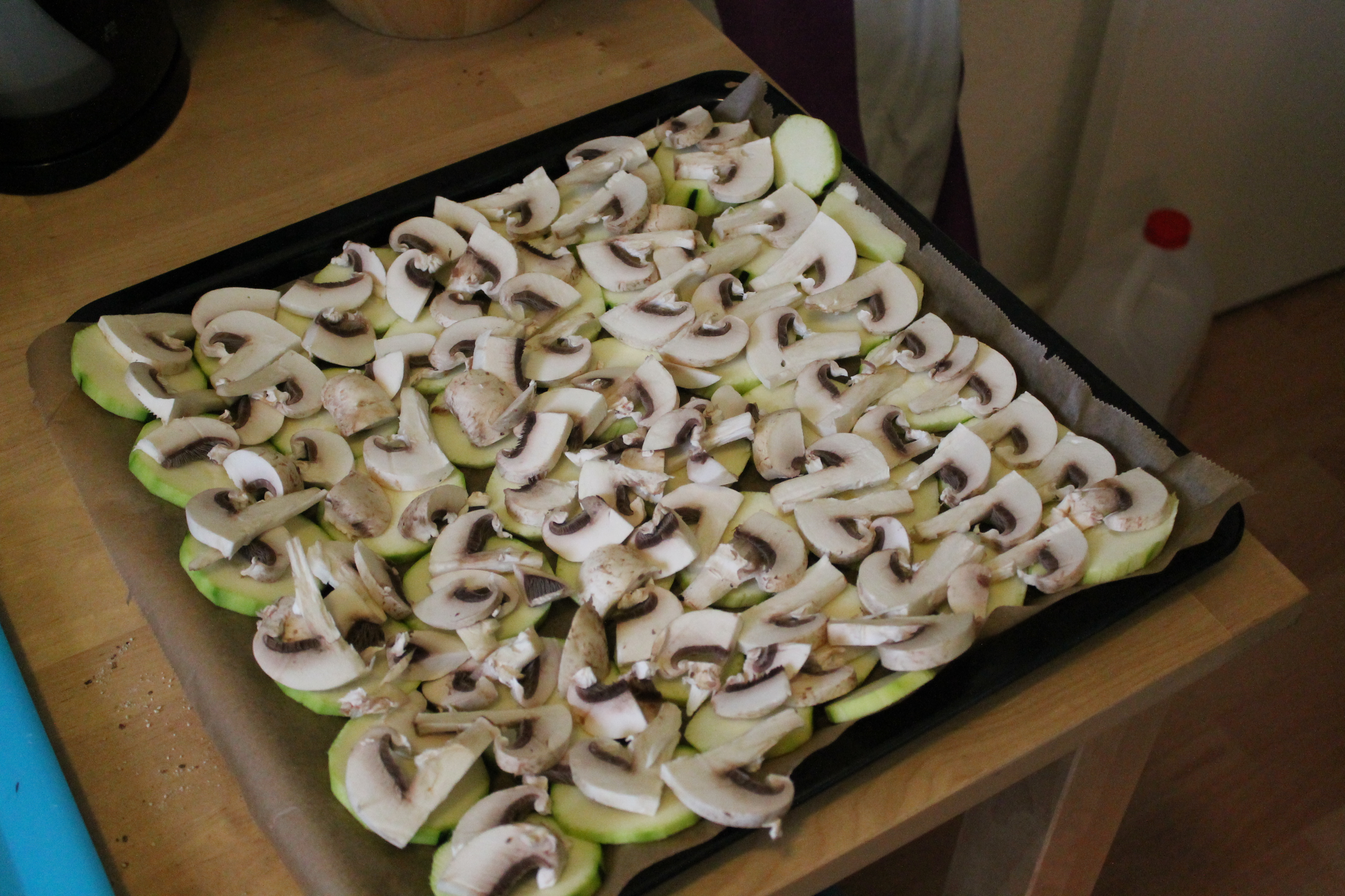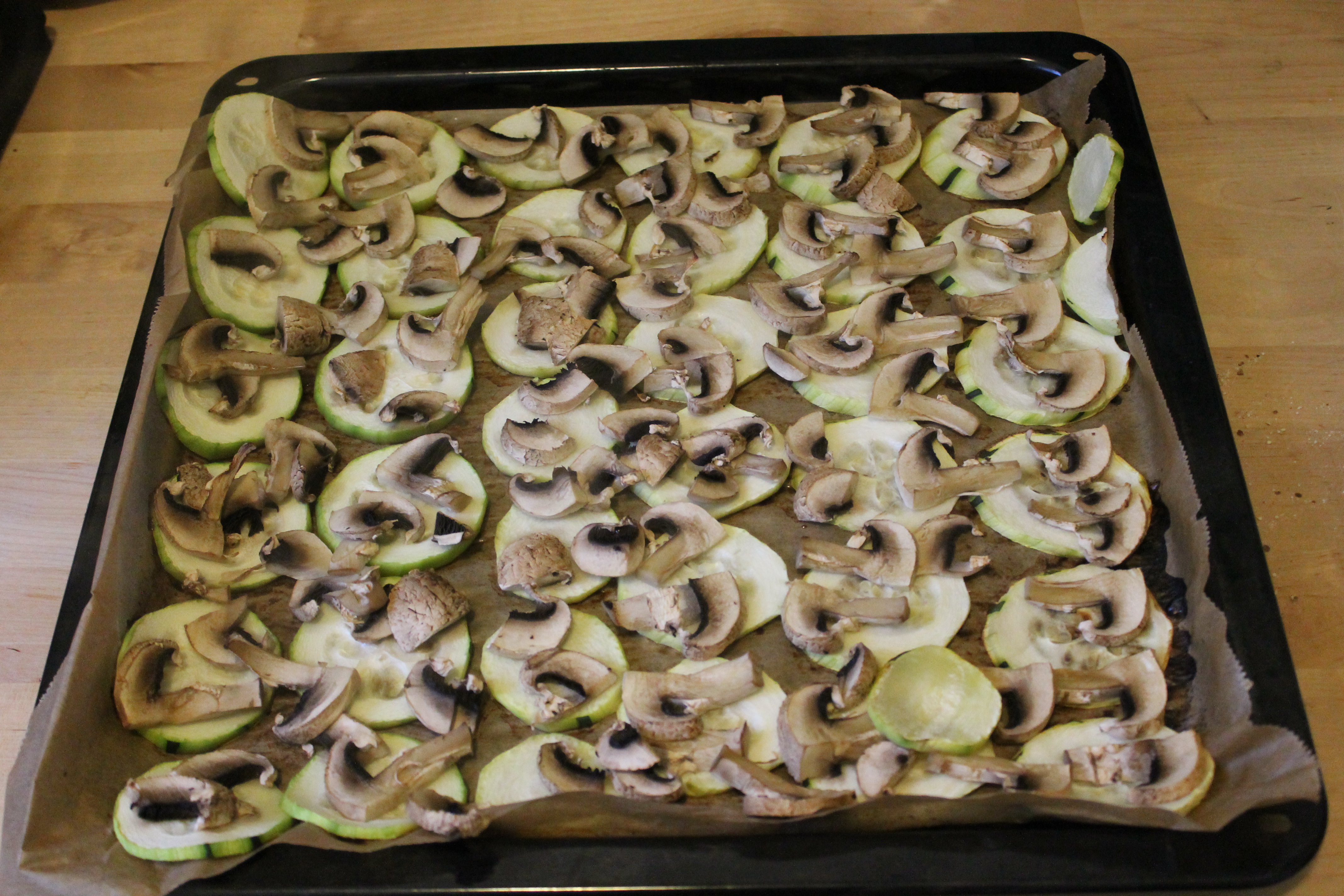 Solche Tiergerichte machen nur irre Tierliebhaber, sich den Aufwand zu machen mit Liebe etwas Leckeres zu zaubern. Hier habe ich ein Blech mit Zucchinischeiben und Champignionsscheiben belegt. Der Ofen wurde vorher auf 200 Grad 20 min aufgewärmt. Das Alles dann für 20 bis 30 Min im Ofen backen. Meine Katzen lieben es und für Damon ist es ein kleiner Snack zwischendurch 😉